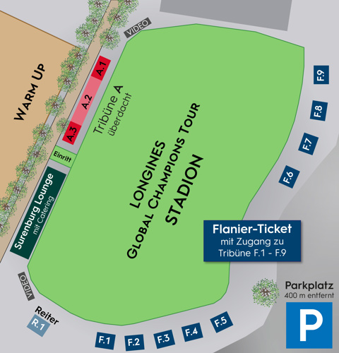 Eine Neuerung gibt es in diesem Jahr bei den beliebten Flaniertickets. Mit jedem Flanierticket haben Sie in diesem Jahr auch Zugang zu den überdachten Tribünen F1 – F9 mit freier Sitzplatzwahl am Rasenstadion. Insgesamt stehen über 1000 Sitzplätze für Besucherinnen und Besucher der LGCT zur Verfügung, eine Reservierung der Sitzplätze ist hier jedoch nicht möglich. Wer einen festen Sitzplatz buchen möchte, sollte sich frühzeitig ein Ticket auf Tribüne A sichern. Neben den Tages- und Dauerkarten haben Besucher*innen in diesem Jahr die Möglichkeit vergünstigte 2er Tickets und 4er-Gruppentickets zu erwerben. Kinder bis einschließlich sechs Jahre haben kostenlosen Zutritt, Kinder zwischen sieben und einschließlich 13 Jahren zahlen 5€ pro Tag und die ermäßigten Preise gelten für Jugendliche von 14 bis einschließlich 17 Jahren, Schüler*innen, Studierende, Auszubildende, Senior*innen ab 65 Jahren und Personen mit Schwerbehindertenausweis.