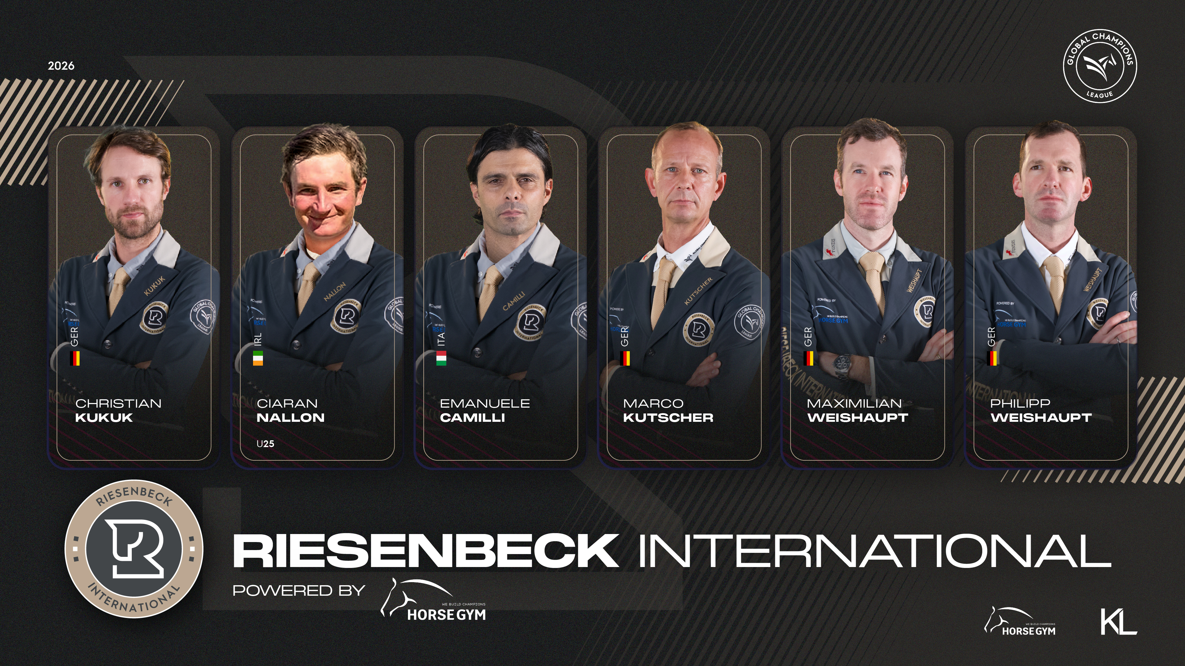 Auch in diesem Jahr ist das Team Riesenbeck International powered by HorseGym wieder in der Global Champions League am Start. Christian Kukuk, Ciaran Nallon, Emanuele Camilli, Marco Kutscher, Maximilian Weishaupt und Philipp Weishaupt vertreten unser Team bei 16 Etappen auf der ganzen Welt.